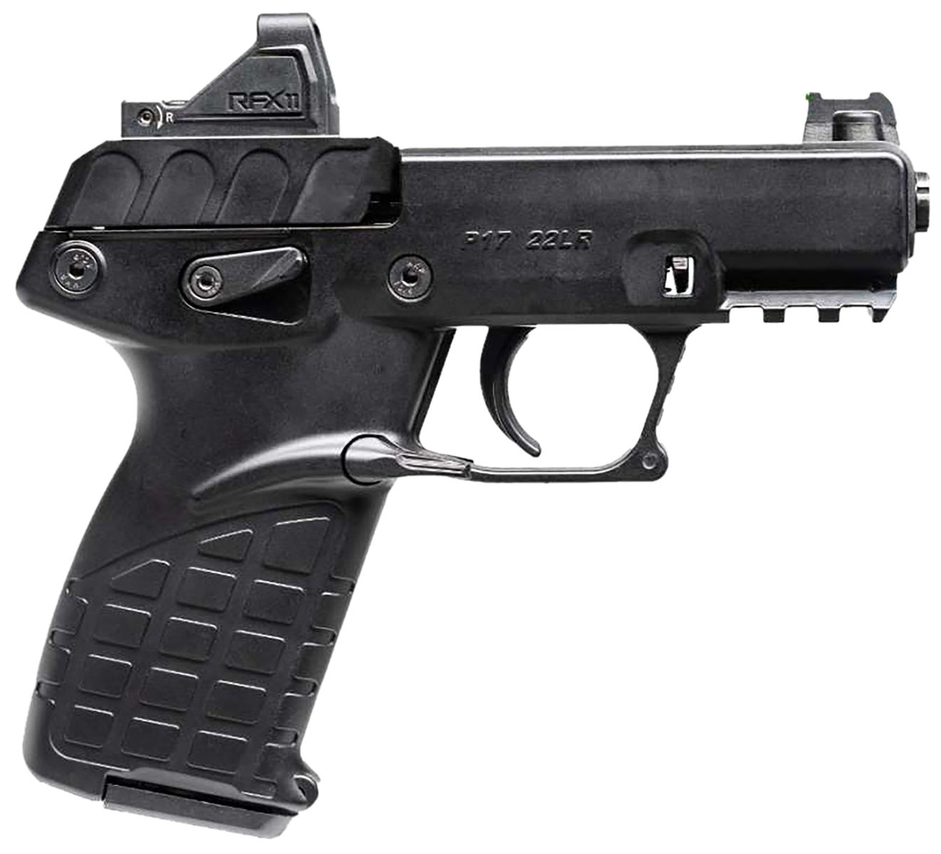Kel-Tec P17BBlackOPTIC P17 Compact Frame 22 LR 16+1 3.80″ Black Steel Barrel, Black Serrated Steel Slide, Black Polymer Frame With Picatinny Rail, Textured Grip, Viridian RFX-11 Green Dot, Ambidextrous