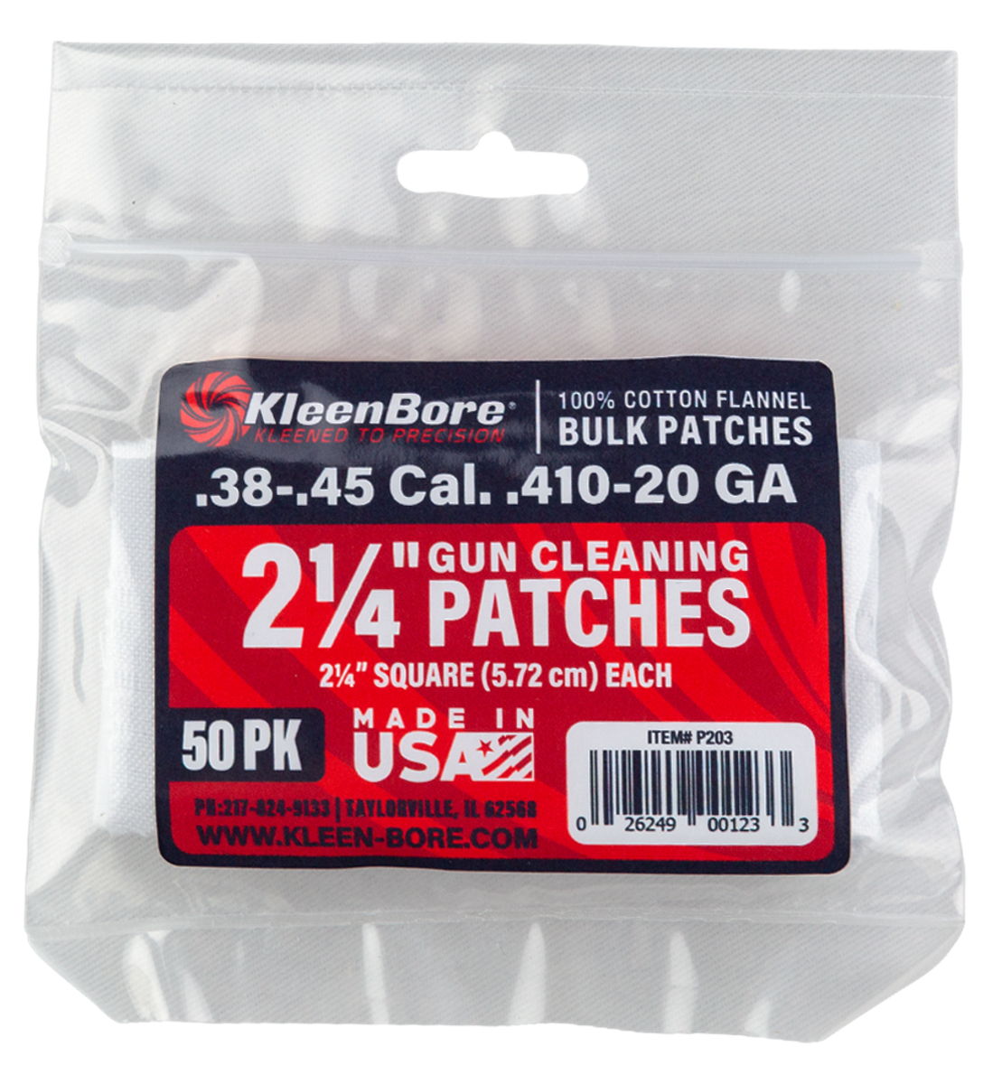 KleenBore P203 Super Shooter .38/ .45 Cal 20/.410 Gauge 2.25″ 100% Cotton Flannel 50 Per Pack